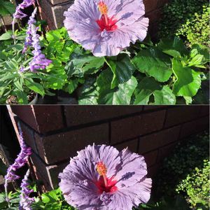 朝日に照らされた「ハイビスカス デニムブルー」 パチリ・パチリ 上はフラッシュを焚いて影の黒い部分を明るくなるようにしました。 下はそのままのです。 好みによると思いますが、上のpicが柔らかい印象を醸し出しているかな。😸