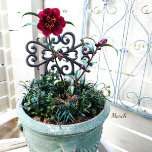 一目惚れしてお迎えした椿をこれまた一目惚れした中古の鉢に寄せ植えしてみました✨ 今年は母と椿を見に行ったからか地植えする場所もないのに椿が欲しくなり、、この椿をお迎えしました。黒椿と言うだけあって渋赤で可愛いです😌