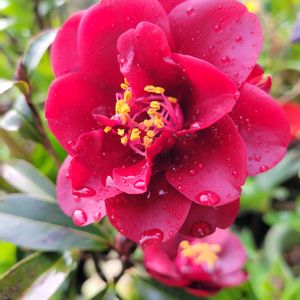 ❤️🖤ナイトライダー(黒椿)❤️🖤 入苑時、「今日はナイトライダーが見頃ですよ」と言われた通り、木いっぱいに黒椿が咲いていました。 何度も訪れていますが、初めて見頃の時に出会い感激です。 午前中の雨で花びらに雨粒が…💧💧💧 ニュージーランド産の大変珍しい黒い椿です。 八重咲きの小〜中輪で黒紅色の花色は魅力的です。 開花期:3〜4月