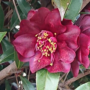 🌞🍃こんにちは✨ 私にも いよいよ花粉症 到来でしょうか💦 今年は昨日から…👀がうるうる〰️眼の縁がヒリヒリ💥… どう対処していいのか 手立ても判らず〰️ 今年も 咲いてくれました🤗💕 黒椿❬ナイトライダー❭ 昨年から比べると 蕾の数が1/3程度ですが〰️ 昨年は 鈴なりだったから~お疲れだったと思います💦 我が家の唯一の椿…です。
