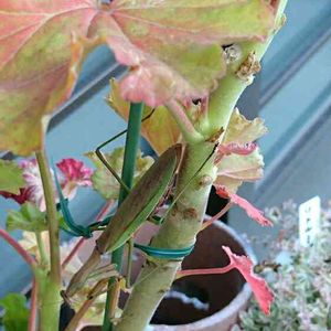 見えますでしょうか? ゼラニウムの茎に、逆さまになって、しがみついているような? カマキリが(*_*) 日がかげって、8度位はあるけど、ひんやりです😅 すごい⤴⤴頑張ってる❗