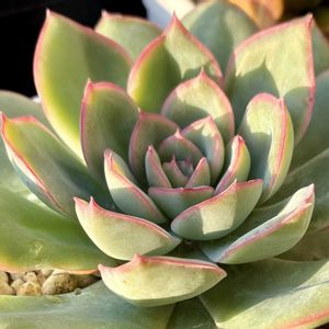朝、不織布を取りに行った時に 朝日に照らされ綺麗だったので パシャリ📸✨ ☘モーニングデュー ぴったりのネーミング😆 もう4年目くらいかなぁ 手のひらのサイズになりました♡ 肉厚の葉にエッジの赤が いいでしょ💓 夏も冬も強くって手のかからない 育てやすいお利口さん🥰