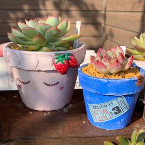 ちょっと前にチャレンジしたリメイク鉢に植え替えしてみた。 左の鉢は、ちょっとさみしくてイチゴ作ってつけたけどなかなか難しいかったよー💦リメイク鉢むずかしっw