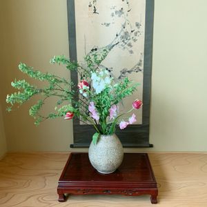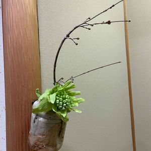 かなり長い枝垂れ柳を数本頂いたのでいけてみました。 写真は床。玄関には白い椿を添えて。 枝垂れ柳の花を見たことないなぁと思っていたら……なんと!この子は雌雄別株で日本には雄株しかないそうです。だから増やすのは挿し木のみ😱ということは……みんなクローン⁉️