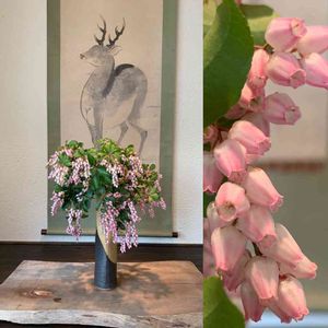 馬酔木を床の間にいけてみました😊 剣山でちょっとダイナミックにできるかなと思ったけど😅 玄関前のたわわな株から 馬酔木さんの幹は意外と細く 花後の剪定を考えて 太いところで切りすぎるのもと思い やはり 投げ入れにしました 触ってるとお花が多肉さんのように ポロポロ落ちるかと思いきや ブンブン振ってもしっかりついています 可愛いお花です💕 鹿さんの足元をゴージャスにしてくれました✨😉