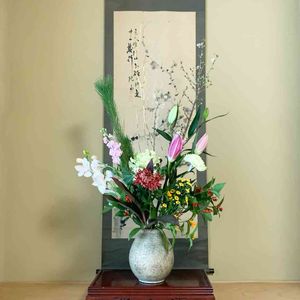 きょうはわがやの床の間にお正月花を この時だけは 華やかに大きく✨ おっきな百合が3つ開くの楽しみ💕