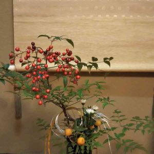 お正月の床の間 全部庭の花(実)で。 南天と金柑と白い小菊、金銀の水引でお正月っぽく。百合も葉牡丹も千両もないけど、まあいいや😆 皆さまよいお年をお迎えください。