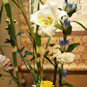 ユリが咲きました❗️ お盆に合わせて1本だけ😆 床の間に活けることが出来て満足。 ヤバネススキ、ユリ、ジニア、ワレモコウが庭のお花。 リンドウとスターチスだけ購入。