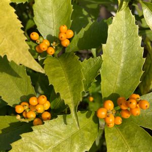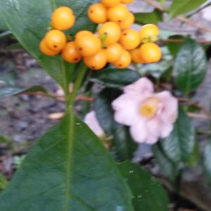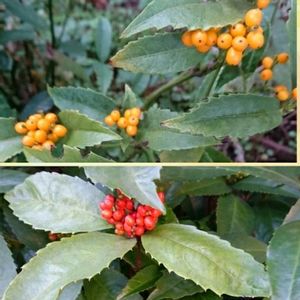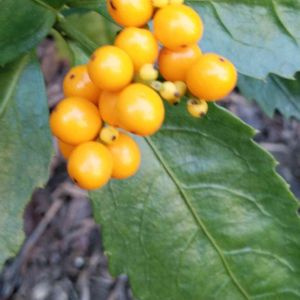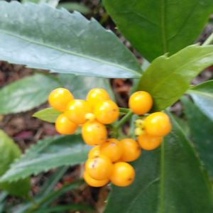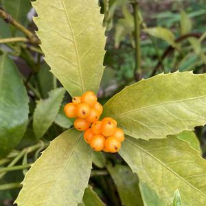 センリョウの黄色い実の品種で、キミノセンリョウ(黄実千両)です。 赤い実のセンリョウと並んでいることもあり、よく見かけることがあります😃