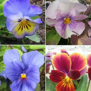 散歩道で見かけたよく咲くスミレ4種 左上から時計回りにライチ、ブルーフィズ、ラズベリー、ブルーハワイ (カシスをラズベリーに訂正します🙇)何やら甘い飲み物🍹🍸の香りが😋 で、お顔はと見れば、やっぱりオジさんです🤣 🏷美しく青きドヨウ 🏷オジさん顔パンジービオラ