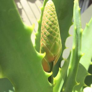 アロエの蕾 2年前に挿し穂をして咲くのは何時やら?と思いきや今朝見たら窮屈な葉の間から蕾が出ていたのです😲 12月頃に花を投稿できるかもしれません😊