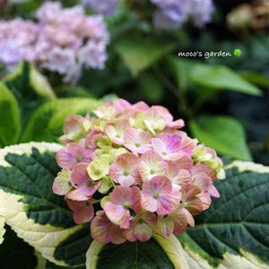 紫陽花 マジカルショータイム(斑入り葉) 同じ枝から全く違う花が咲いた😳 昨年は上みたいな感じ。 下は花も斑入りみたい〜😊 しかもギザギザ✨