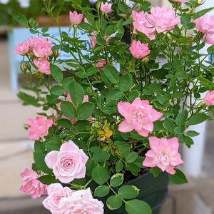 予約していたバラが昨日届きました🌹 大苗って書いてあった割に華奢な感じです。 でも私的にはこんな感じから育てるほうが好きです☺️ 品種は 『ローズワルツ』 左下の画像は先輩バラ2つを従えて、 ローズワルツ with B(バラ) って感じです笑 ネタが古っ🤣 とげなしバラです。 私にも危なくない笑 さすがに蕾はなかったので来春を楽しみにします。 以下、バラの説明です Rose for You (ローズフォーユー/THE ROSE SHOP オリジナルセレクション) Group: Flagship ・四季咲き小輪系 ・作出国 日本 ・発表年 2019年 ・花色 ソフトピンク ・花形 レンゲ咲き ・花径 3-5cm ・花弁数 15-20枚 ・芳香 微香 ・樹形 半横張り ・樹高 0.5-0.7m レンゲのような花形で房咲きタイプの小輪系のバラ。 ピンクのグラデーションが美しく、小ぶりな花をたくさん咲かせる可愛らしいバラです。 花弁が強く花保ちが最良◎トゲが全くない点も大きな特長です。 葉も丸葉で全体的にバランスのとれたバラ。 春から秋まで休むことなく連続して咲き続けます。 冬の剪定は浅めに鋏を入れることがポイント。春の花付きが良くなります。 病害虫にも強くとても育てやすいバラなので安心です。 鉢植えに適していますが、花壇などの前列にまとめて植えると見事です。
