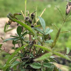 虫が寄り付かないと聞いて畑にレモンマリーゴールド植えたんだけど 虫が過多まっているんだけど 蜂🐝かなー あえて駆除はしないけど 近くにイチゴ🍓の苗2本あるので