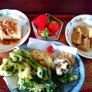 昼餉🍚🥢 春の恵み膳 精進揚 絹さや 竹の子 椎茸 パセリ コゴミ たらの芽 筍煮物 冷奴 イチゴ🍓 美味しく頂きました🙏