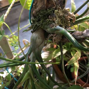 こちらはチランジア・エクステンサ。 吊るして育てているエクステンサです😊。 葉先が少し枯れ込んでいますが、新しい葉を次々に出してます😃。