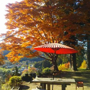 登米市東和町にある 若草稲荷神社 赤い傘と紅葉🍁が ベストマッチング👍