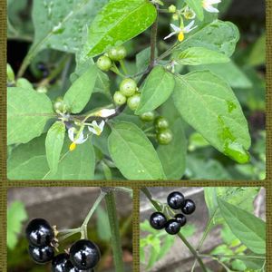 10月16日撮影 我が家の前になぜか生えてきたイヌホオズキ。 実がめちゃくちゃツヤツヤです。 アメリカイヌホオズキだと勝手に思っていましたが、こんなにツヤッツヤなのはテリミノイヌホオズキですか??? 調べたところ、緑色の実に白い斑点が見えるというのも特徴の1つだとか。 白い斑点ありますね! テリミノイヌホオズキは北アメリカ原産のSolanum americanumとされており、特徴は果実のフケ状班紋 white flecks が明瞭であることである。タイプを分けているが分けない方が現在の主流である。 Solanum americanumは4タイプあるともいわれ、日本でテリミノイヌホオズキとされている植物には明らかに複数の分類群が含まれ、垂れ実型(球状顆粒有り)とカンザシイヌホオズキ型(球状顆粒無し)の2タイプが確認報告されている。 テリミノイヌホオズキのカンザシイヌホオズキ型は果実の付く形がカンザシのようで、特徴があり、気づきやすい。 カンザシイヌホオズキ型の典型的な形は日当たりの良い場所で見られることが多く、よく分枝し、葉は幅がやや狭く、ほぼ全縁が多く、場所によっては波状鋸歯も見られる。やや日陰にあり、分枝が少なく、花序も少ないものは葉幅が広く、湿り気が多いと鋸歯がはっきりし、下部に波状の鋸歯のある大きな葉が残っていることがある。やや湿った場所では、上部の葉まで波状鋸歯がはっきりしている場合もある。葉の厚さが厚いものが多く、葉の毛は少ないものと多いものがある。花つきもよい。花はやや小さいものが多いが、大きさに変化があり、大きいものは直径12㎜に達するものも見られる。花序枝が長さ7~14㎜、小果柄は長さ約7㎜で上向き、枝によっては横向きで、垂れ実型のように果実が下向きに垂れ下がらない。ただし、はっきり垂れ下がるものが混じるときもあり、これも含めているが疑問が残る。 (三河の植物観察 より) ううう、わかりませーん。とにかくテリミノイヌホオズキにはいろんな種類があって、これはたぶんテリミノイヌホオズキなんですが、カンザシイヌホオズキ型ということでしょうかね??? テリミノイヌホオズキ?(照り実の犬酸漿) ナス科ナス属