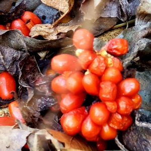 おはようございます😊 ムサシアブミの実 枯れ葉に被われて探せなかった赤い実が👀に焼き付きました。😆😆💕🍀 やはり毒性ですねぇ🍀 花言葉は「偉大な勇者」