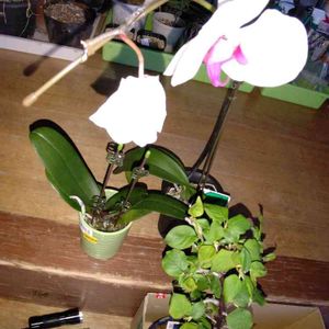 昨年10月に頂いたランが咲いた。胡蝶蘭の小型で白色と思っていたのに!名前をご存知の方、ご教示ねがいます。