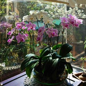 譲り受けたミニコチョウラン、今年も開花に成功しました🌸 品種改良され昔に比べ栽培が容易になったそうです♪ 冬はガラスのフラワーベースに3株、寄せ植え風にして管理しています。