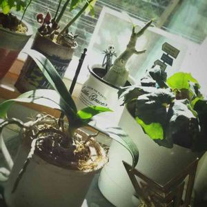 鉢から脱走間近 お風呂の窓の方に向きたいのかも? これでも機嫌が良くて、今は花芽が20㎝くらい (これは少し前の) 春になったらビカクシダのように何かにくっついてもらう予定