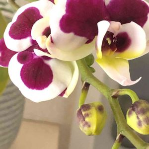 ミニ胡蝶蘭が今年も咲いてくれました‼️ 嬉しい〜💕💕💕 この子は白地に不規則な紫の模様が入るのですが、蕾の時から模様がついています✨面白い子です😆😆 実は2017年の12月31日に投稿しているのですが、その時はお迎えしたばかりですごくステキな大きなお花でした😍 でも今年は半分の大きさになってしまいました💦💦春になったら植え替えてあげなくちゃ✨✨✨ 池江選手、これからという時にショックだろうなと思います💦 早期回復されることをお祈りします✨✨