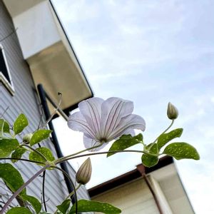 クレマチス フルディーン 植え替えの時、ポキって折ってしまって焦りましたが、残った枝からモリモリ復活して、ついに開花✿ 嬉しい〜😆 地味な花だけどシルバーががった白が渋くてステキ😍