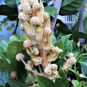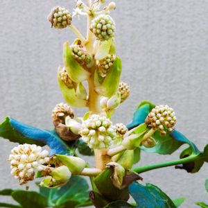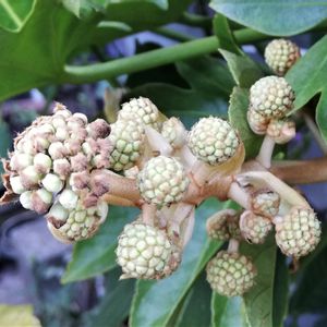 ヤツデの蕾 2022-10-31 昔,自宅の庭木だったヤツデの花に,アブとハエがたくさん寄ってきたことを思い出しました。この花の成分を調べれば,昆虫誘引剤ができるのではないかと皮算用したことが懐かしいです。