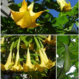 おはようございます😃 エンジェルストランペット 和名 キダチチョウセンアサガオ(木立朝鮮朝顔) 別名 ブルグマンシア ナス科キダチチョウセンアサガオ属 草ではなく「木」 上段 右上に蕾 右 若い実 (蕾かも) 散歩で 11月8日