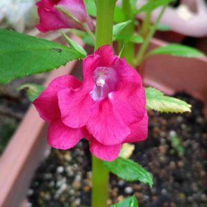 こぼれ種のホウセンカが咲き始めました😄 先に見つけて移植した子ですが、他にもあちこちに芽が出てます😅 弾けて増える、、強いですね〜🌱✨