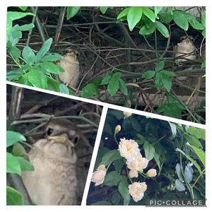 白のモッコウバラがすごいボリュームで毎年咲きます。 鳥が良く巣を作るのですが、今年はどの子かな?と楽しみです。 巣からピョコピョコ出て巣立ちの練習が始まりました。 モズでしょうか? 可愛いです💕