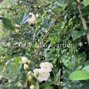 ꕤ*。゚モッコウバラ シロꔛꕤ*。゚ 小さな子をお迎えして4年くらいかなぁ 😁 北側 しかも鉢植で壁沿い3メートル のシュートいっぱいに咲いてくれました💗 頑張ってるモッコウバラさんです💗