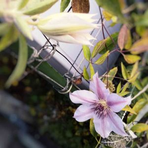 気になっているクレマチスのツボミ。(真ん中の上の方) 開きかけの状態で、足踏みしています。