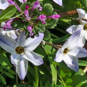【花韮】《ヒガンバナ科・ネギ科》 花言葉 「星に願いを」「悲しい別れ」「卑怯」 「恨み」 星型をした可愛らしい花姿が 特徴のハナニラ 青や白、ピンクの花を咲かせ、 6枚の花びらで構成された小花が印象的です 光に反応する性質なので 太陽に向かって花を咲かせ 夜や曇り、雨の日は花を閉じます ハナニラは有毒のため観賞用です 葉だけの時はハナニラもニラの香りがして間違いやすい。