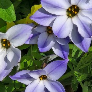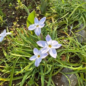 「イフェイオン」(ハナニラ) 植え付けてからずーっと葉っぱばかりだったので気にかけてなかったらいつの間にか咲いていました😊 後ろ側に植えてるヒヤシンスはやっと花芽が見えてきました🪻