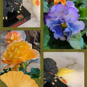 🐥毎月15日はインコの日🐥 そして本日11月15日は年に一度の「いいインコの日」ですね✨ 本当は忘れてて急いでコラージュ作りました(;´д`)⤵️ わが家のパンジーとバラ、そしてGODZILLAくんと戯れるオカメちゃんです。 🏷️毎月15日はインコの日 🏷️いいインコの日 参加させて下さい❣️
