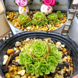 🏷インコの日 ① 🏝️で手直しに使用した 赤みのオロスタキス昭和さん 群生の残りを植替えました✨️ ② 2個買いで安売りしていたので オロスタキスと一緒に購入した エケベリア白鳳さんも植替え✨️