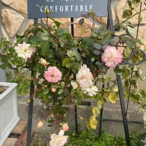 こちらも購入品のミニバラ。 すでに綺麗に開花かし、蕾もまだたくさん✨グリーンアイスかと思ったけどお店の方はピンクが濃いから違うんじゃないかと。白とピンクが混ざり合って枝垂れて咲く姿が可愛くて2株購入‼︎