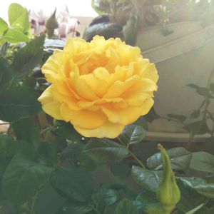 我が家の鉢植えの1画です 💛黄色のミニバラの蕾が色づいてきました〜 クチナシとポポラスの葉っぱ🌿 ブルーデージーペガサスとユリオプスデージーの花も咲いてます💚🤍💛 🏷️金曜日の蕾たち に参加します〜