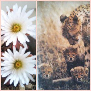 おはようございます!😄 今日の天気は晴れです☀ 左側 『細雪』🌱🌼 ずっと放置していたのに、可愛い花を咲かせてました🤭💕 右側 むか〜し、何かの雑誌に載っていて、何故だか心惹かれずっと持っています😸 ヒョウの母親と3匹の子供達💖 自分と3人の息子達とを重ねて見て、自分もこう有りたいって思ったのかもしれません😊 実際は…こんな風な寛大な母ではなかったと思います😹