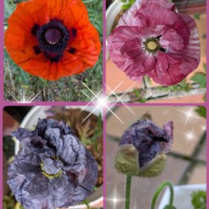 おはよーございます🌤️.° 白雪姫の森~ 今日は『ポピー』🤭︎💕︎︎ ↖️このオニゲシは大福とお散歩中に歩く遊歩道の木陰に咲いていて、鮮やかなオレンジ色とお花も大きくて1株で10輪位咲いて風に揺れてる姿が優雅でした🧡🖤✨ ↗️昨日のお散歩で寄った近くのHCで、花友TENTENNさんのpicで一目惚れしたパンドラサンに出会った😍💘 全部咲いてたので綺麗な子を(σ´∀`)σゲッツ!! ↘️同じく前から探してたアメージンググレイサンとも出会った٩(๑>ᴗ<๑)۶ワーイ 全部ツボミやったんで1番膨らんでる子を(σ´∀`)σゲッツ!! ↙️で、今朝アメージンググレイサンが咲きました💜🩶✨ 実際に見る事が出来て嬉しい⤴⤴⤴ *.(๓´͈ ˘ `͈๓).* さぁ、種を採るぞー( *˙0˙*)۶オー❣️