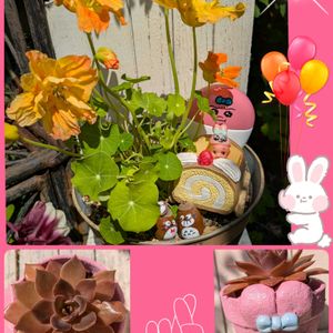おはよーございます☀ 白雪姫の森~ 今日は『ナスタチウム』と『エケベリア』🤭︎💕︎︎ ⬆️元気が出るビタミンカラーのナスタチウム💛🧡 いちごみるくちゃんが贈ってくれたおぱんちゅキユピちゃんと、のりたまちゃんが贈ってくれたドングリちゃん&ドングリトトロちゃんと一緒に📸パチリ✨ ↘️いちごみるくちゃんが贈ってくれた、おぱんちゅうさぎちゃんの鉢🩷🐰 ↙️その鉢にエケベリアのブラックプリンスをIN❣️ 🏷𓈒𓏸︎︎︎︎おぱんちゅの日 参加させて下さいね(💖ᴗ͈ˬᴗ͈)ペコリ。:.゚ஐ⋆* 今日の札幌は23℃予報❣️ そやけど久し振りにスッキリ晴れて暑く感じます- ̗̀ ☀️ ̖́- あと、ポプラの綿毛が雪の様に降ってきて道路脇に積もってたり、網戸にへばりついて大変なのさ~😫💦 皆様、今週もありがと〜🙏🏻💞 素敵な日曜をお過ごし下さいね🤗💓