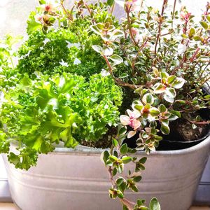 晩秋に作った寄せ植え ガレージに入っていましたが、玄関に移動しました。 タイムがかわいい❤️