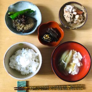 お盆のお昼 行事、ままごとみたいな御膳に お供えするんだけど… ナイから普段の器に持って お経を唱えた後に頂きました😊 久しぶりにゆっくり食事 一族揃って、のんびり食べる習慣 職場で食事すると一番遅いかも?! この後はお茶とデザート🍑 やっぱり和食が落ち着きます。 今夜はご先祖さまが帰っていきます。 冷酒を一杯だけお供えしようか🤔