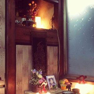 今年は姑の初盆👵 無宗教なのでお坊さんとは縁がなく、子供達集まって一緒に御墓参りしました。 仏壇も位牌もなく遺影の近くにお盆花生けました🙂