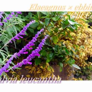 雨が降らなかったのでちょっと庭木の剪定🍀 以前投稿した八重クチナシを挟んでサルビア・レウカンサ(メキシカン・ブッシュ・セージ)🍀 クチナシにはオオスカシバの幼虫が葉っぱをムシャムシャ😱 あとネットでギルト・エッジを検索すると、何故かギルド・エッジになる⁉️tなのに😢