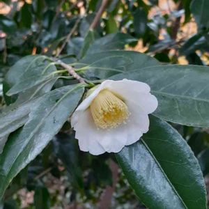 うつむきがちに咲いています 清楚な白い椿です