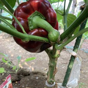 パプリカ パート2 デッカいパプリカの収穫前 枝より太いヘタ🤭 いい具合に支えの枝がありました 🫑複数投稿できなくて 記録投稿です🫑