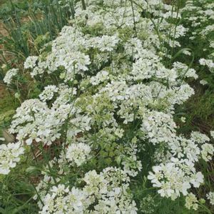 畑のグループの、ご主人は半分野菜、半分花を育ててことしは更にオルレアが増えてはレースを見てるみたい🎵 イチゴもたくさん!野菜の苗は種から育てられ私達三人のおばさんにもいつもキャベツ,などわけてくださいます。 帰りにこのオルレアのこぼれ種からの小さい苗を二本もらって 庭のすみに植えてみました。 数えきれない花達を見ながら野菜の手入れできるのは感謝です。 今日もありがとうございました。 🏡🏡🍀💚🍃💕